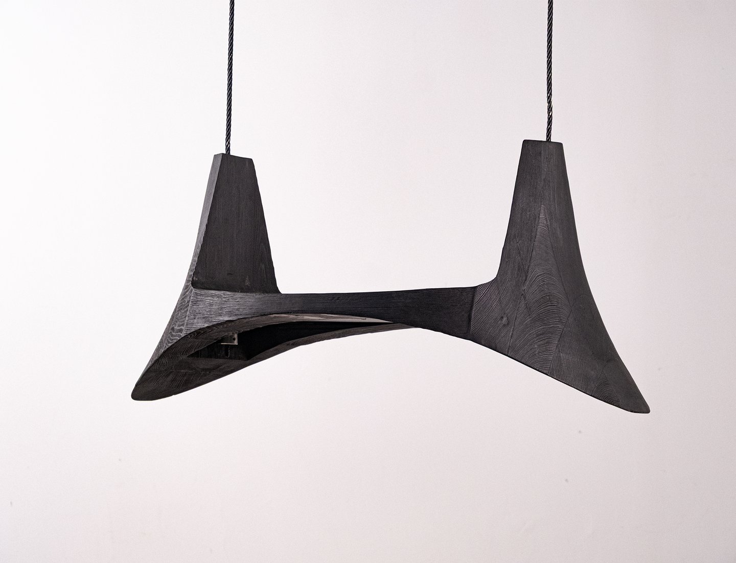 Initial prototyping was executed in Western Hemlock, selected for its superior grain structure and dimensional stability. The surface treatment employs the traditional Japanese Shou Sugi Ban technique, a controlled charring process that enhances the wood's durability and imparts a distinctive, rich charcoal finish. This method not only fortifies the material but also accentuates its natural texture, contributing to the piece's refined visual presence.
